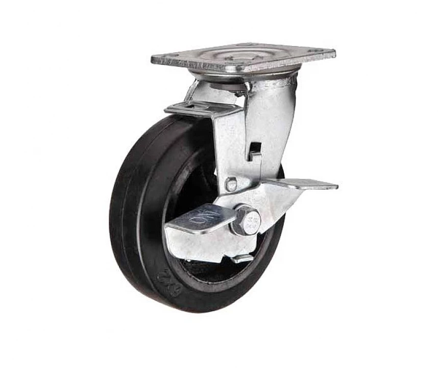 Колесная опора большегрузная поворотная с тормозом (литая черная резина, чугунный обод, в оси - роликовый подшипник)