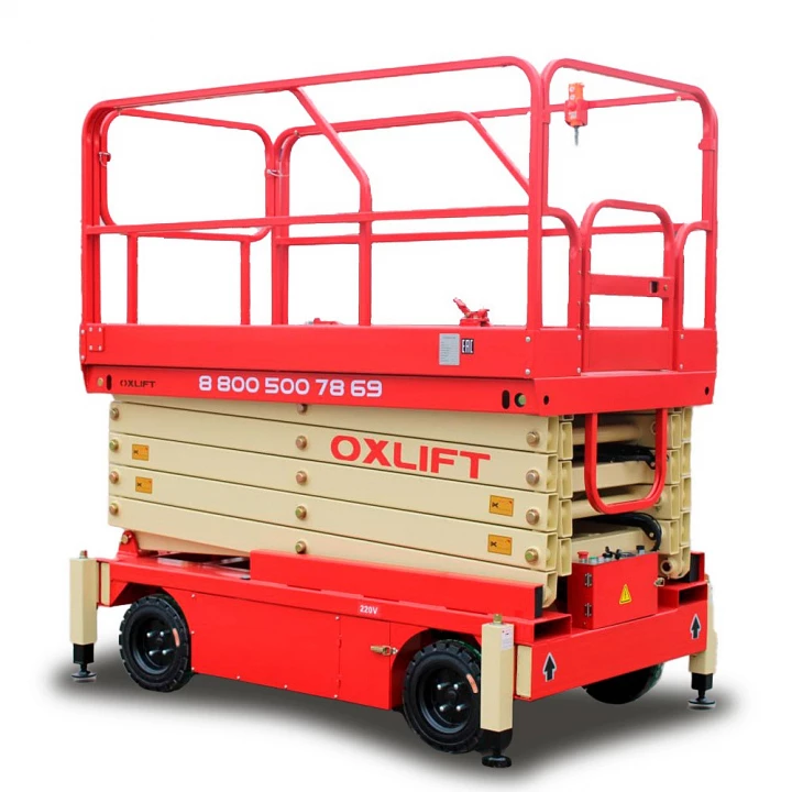 корзина), закрепленная на рычажной системе ножничного типа, которая крепится на основании. Подъемник передвигается на ручной тяге, оснащен (DC/AC). Питание от розетки и от аккумулятора.